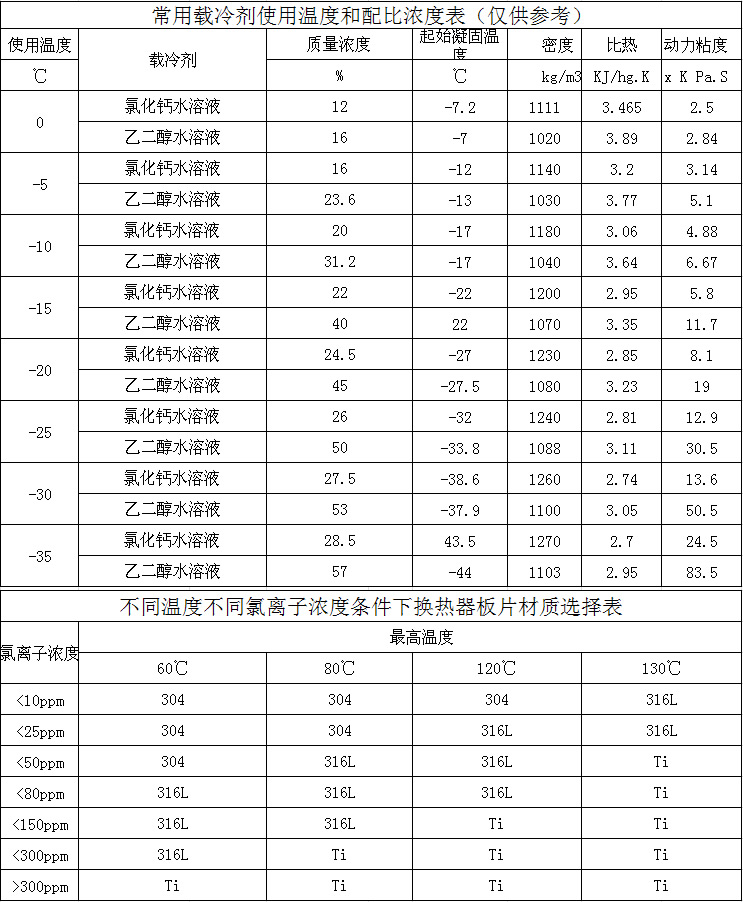 常用载冷剂使用温度和配比浓度表(仅供参考)