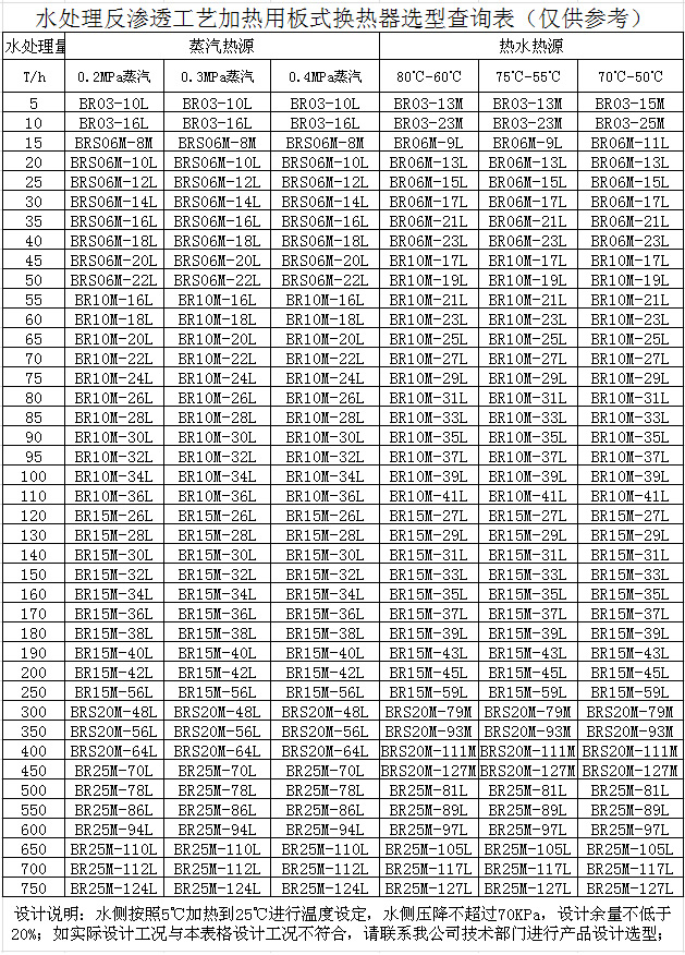 水处理反渗透工艺加热用板式换热器选型查询表(仅供参考)