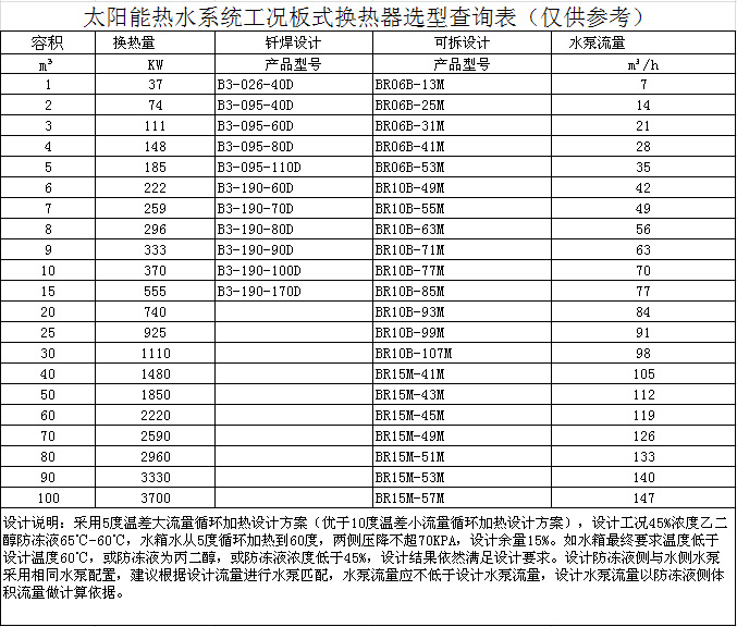 太阳能热水系统工况板式换热器选型查询表(仅供参考)