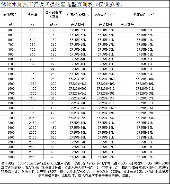 泳池水加热工况板式换热器选型查询表(仅供参考)