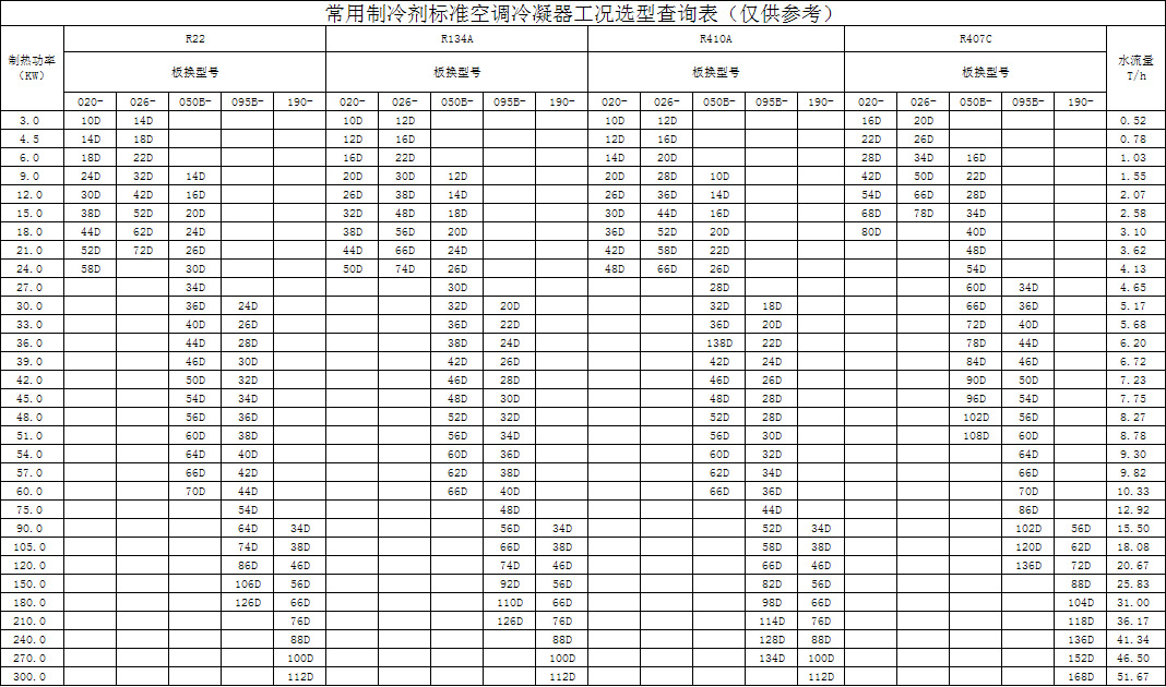 常用制冷剂标准空调冷凝器工况选型查询表(仅供参考)