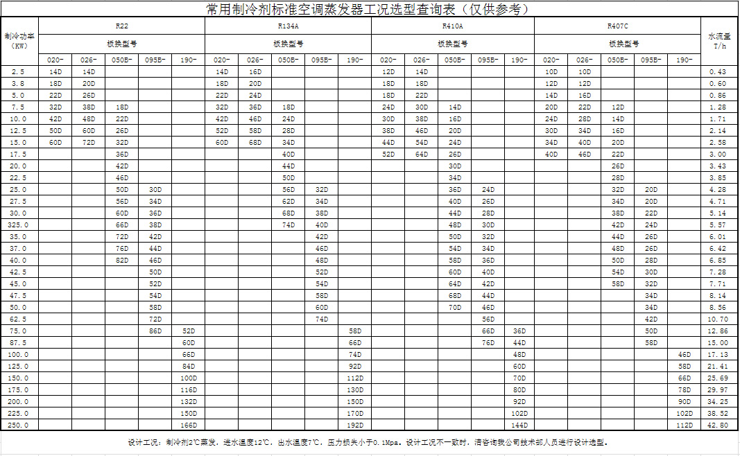 常用制冷剂标准空调蒸发器工况选型查询表(仅供参考)
