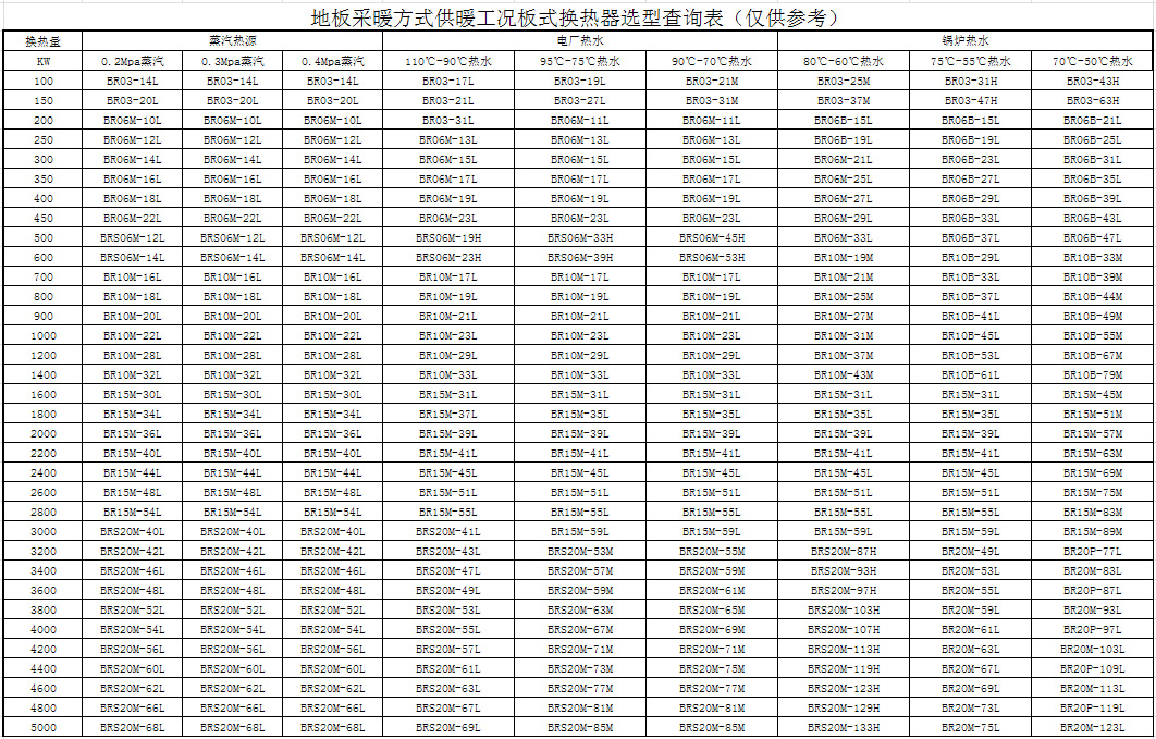 地板采暖方式供暖工况板式换热器选型查询表(仅供参考)