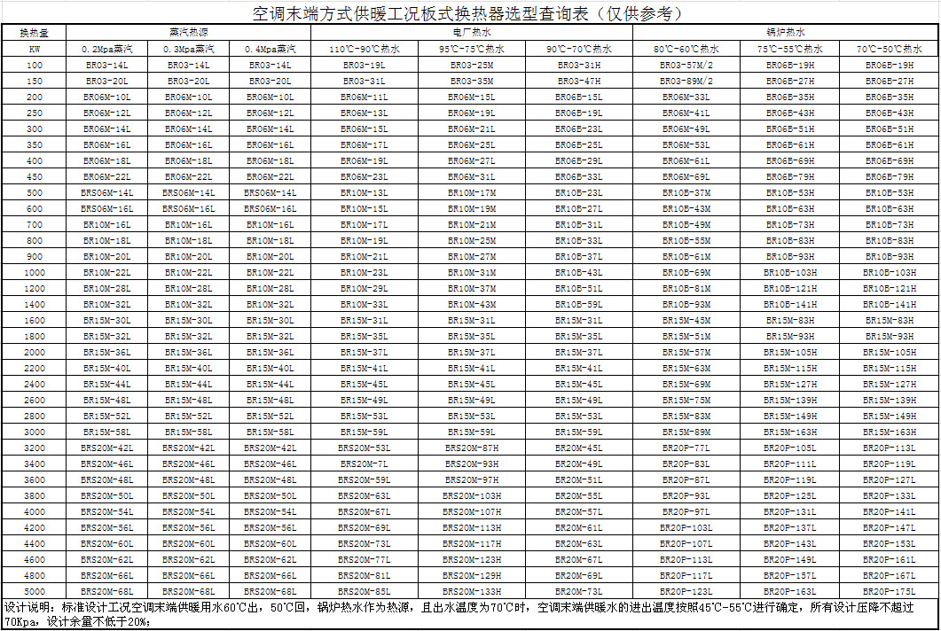 空调末端方式供暖工况板式换热器选型查询表(仅供参考)