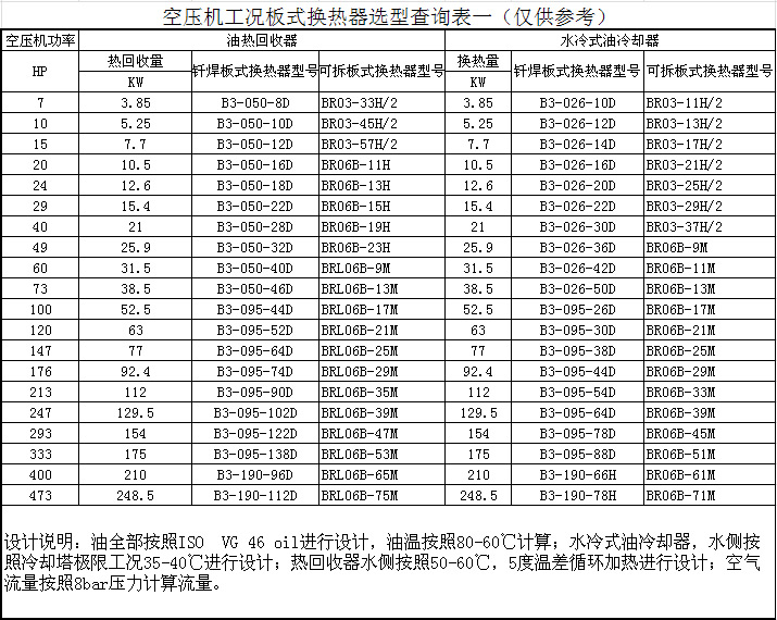 空压机工况板式换热器选型查询表一(仅供参考)