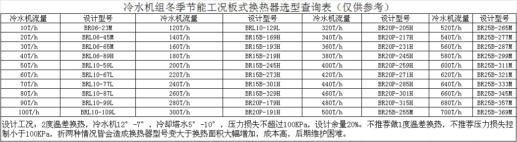 冷水机组冬季节能工况板式换热器选型查询表(仅供参考)